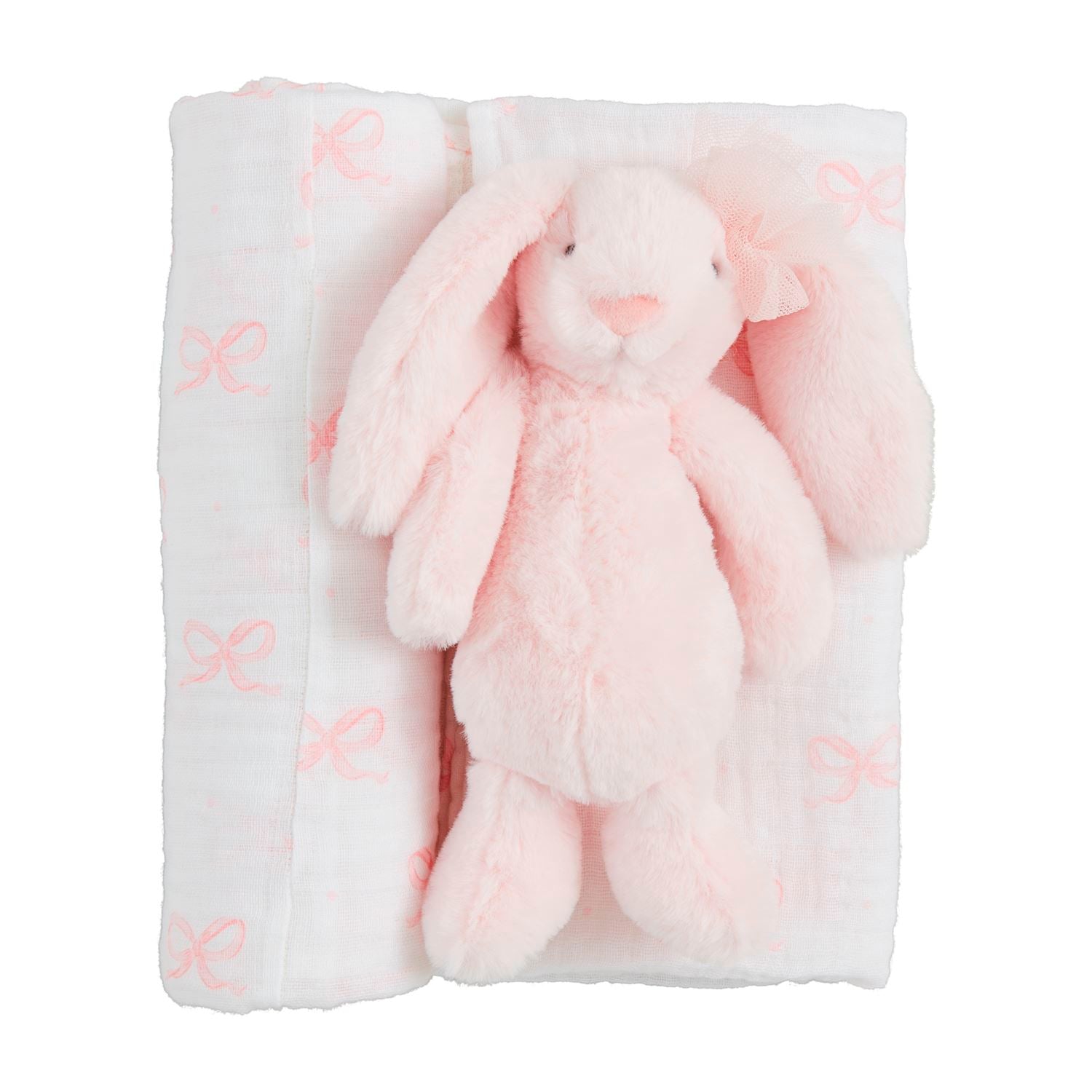 Bow Swaddle And Rattle Set is a delightful 2-piece collection perfect for new parents and their little ones. The set includes a generously sized muslin swaddle blanket, measuring 47 inches by 47 inches, crafted from 100% cotton for a soft and breathable feel, ideal for keeping your baby cozy and comfortable. Accompanying the swaddle is an adorable plush mini bunny rattle, measuring 5 3/4 inches, made from 100% polyester faux fur, providing a gentle and soothing sound to entertain and calm your baby. This charming set combines functionality with playful design, making it a thoughtful gift for baby showers or a lovely addition to your nursery essentials.