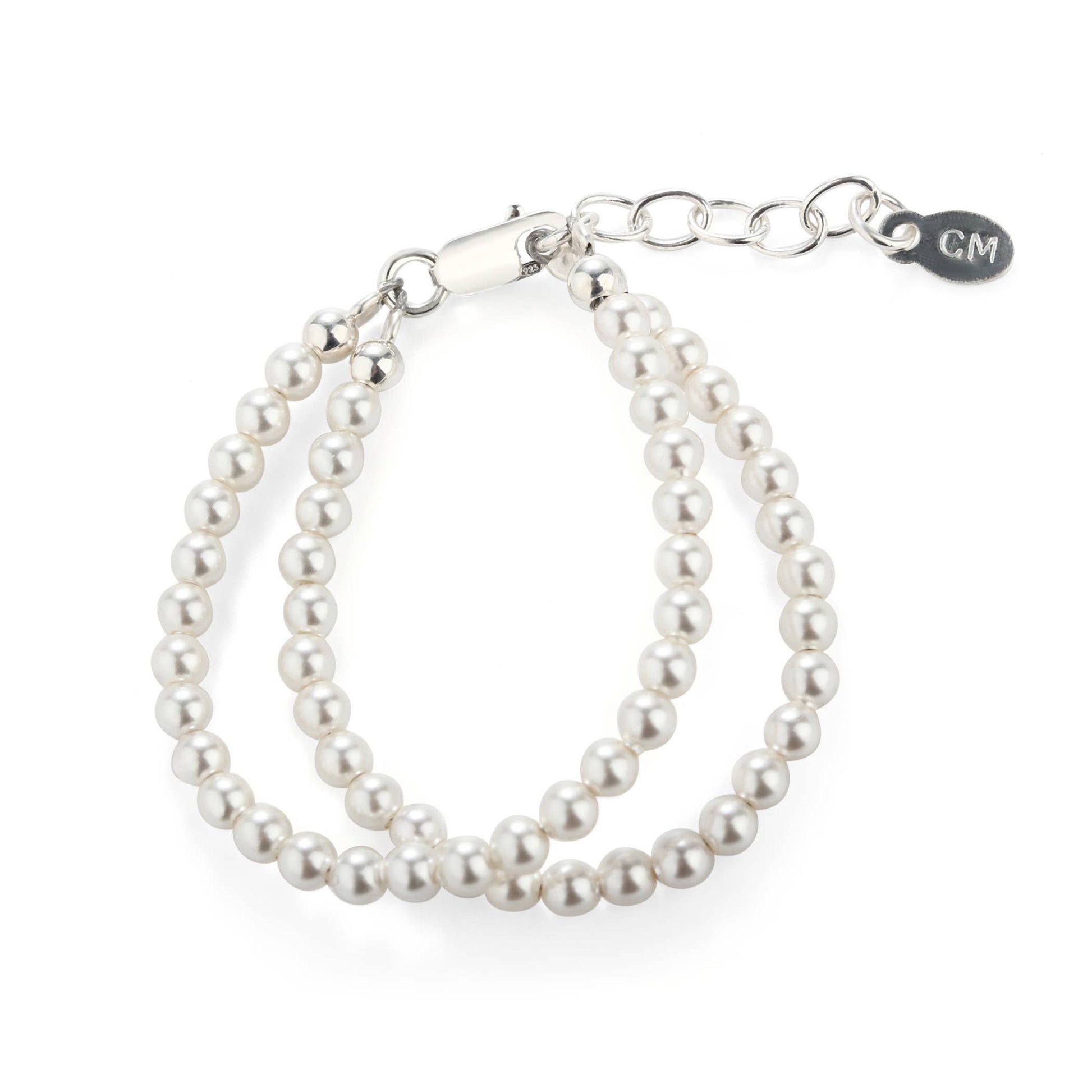 Special keepsake bracelet adorned with sterling silver and a double-strand of beautiful soft high-end Austrian simulated pearls. Each bracelet has an extension chain, so as the child grows you just move to the next link for a perfect fit. This bracelet is available in three sizes and is great for infants, babies, toddlers, and kids. This jewelry comes in a beautiful gift box and is hand made in the USA! Celebrate these cherished moments with this keepsake she will treasure forever.