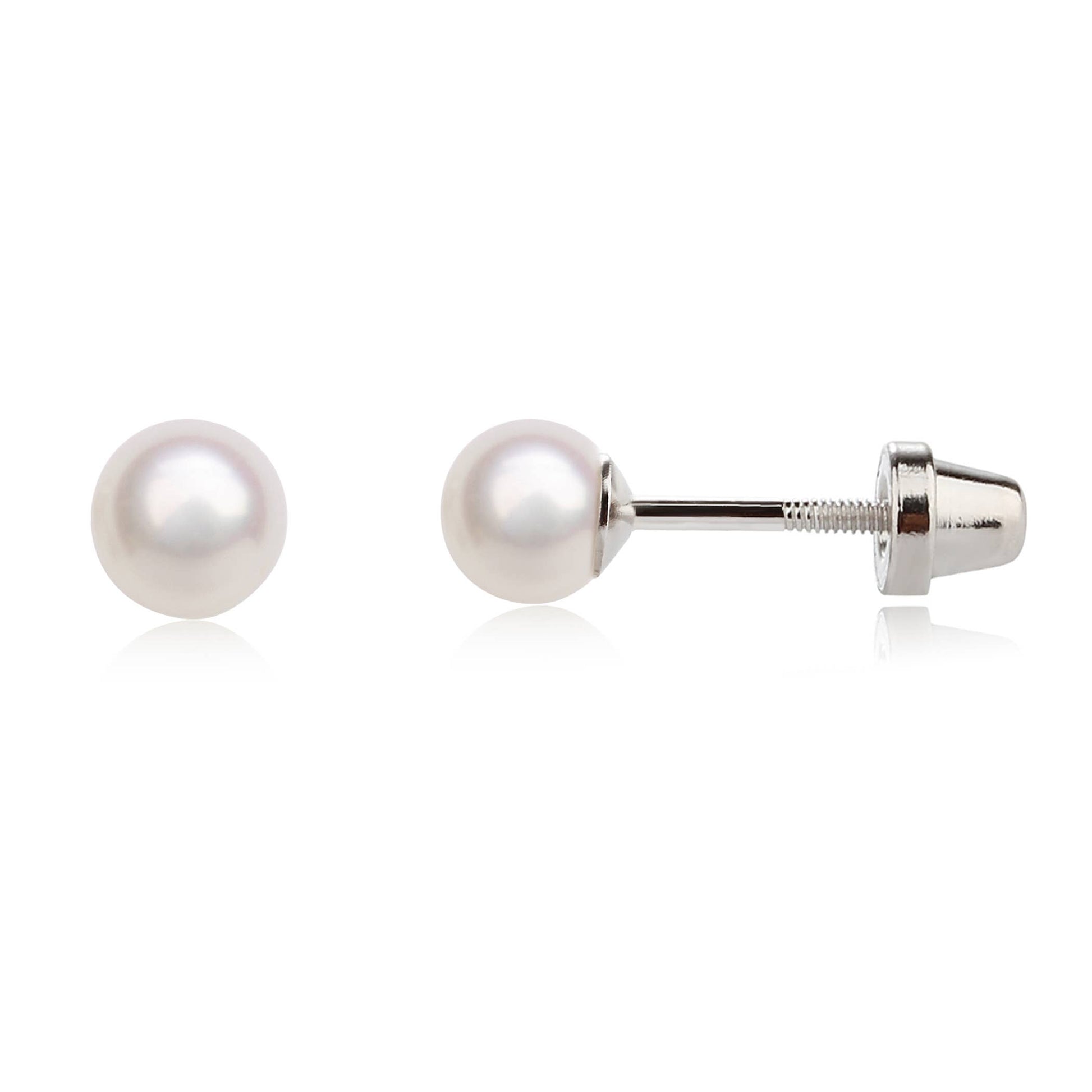 Sterling silver white pearl stud earrings - classic and timeless! These earrings have screw backs that are so nice for children so they stay put and she won't lose them. Earrings include an extra hypo-allergenic, anti-tarnish finish to keep your pieces sparkling beautifully for years and come in darling black velvet heart gift box!