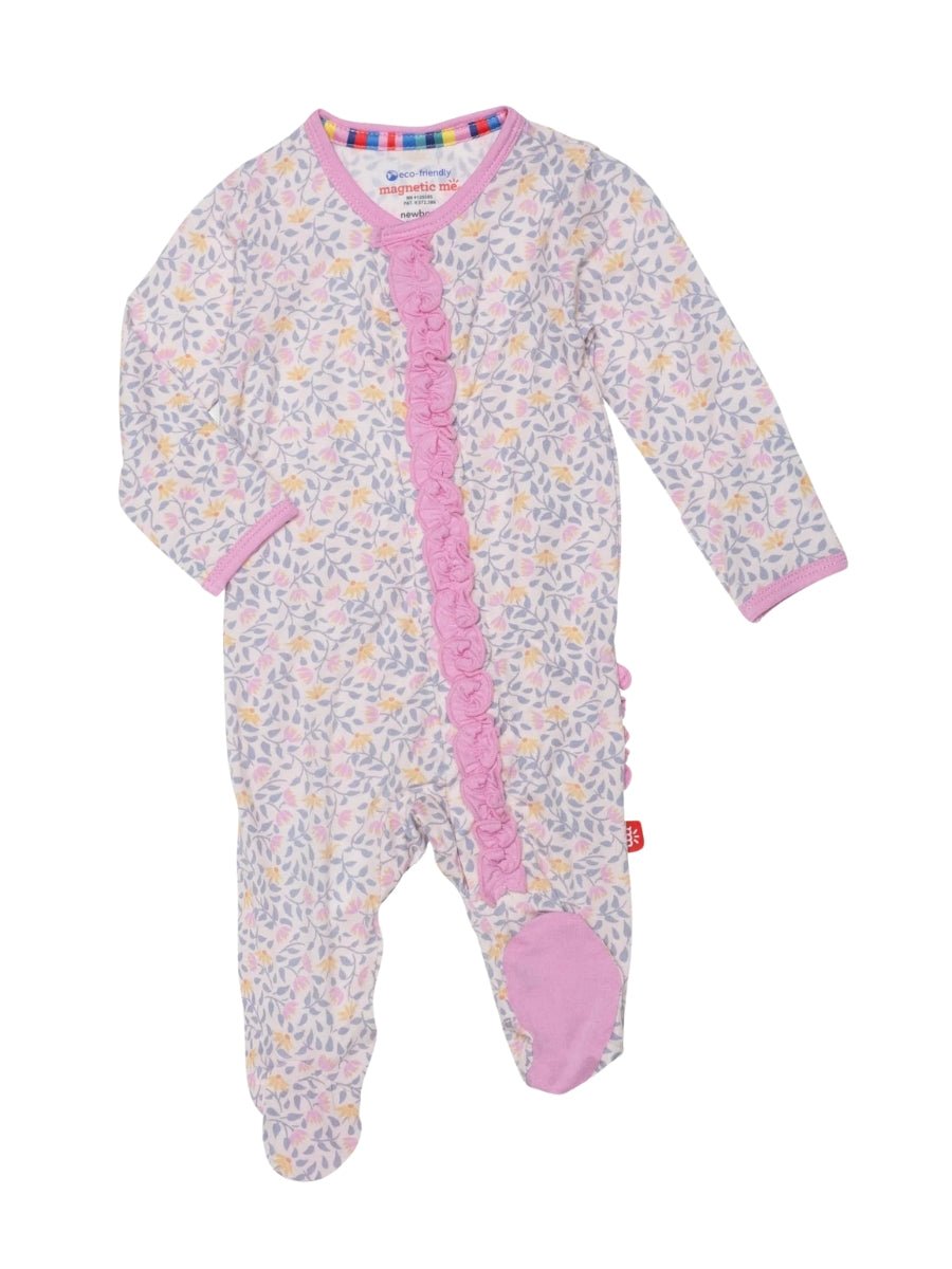 Discover the Amelia Modal Magnetic Footie with Ruffle, a delightful essential designed for easy, quick changes day or night. With silent magnetic closures, this footie makes middle-of-the-night changes stress-free. Crafted from eco-friendly TENCEL™ modal, it’s luxuriously soft, breathable, and perfect for sensitive skin, with temperature regulation for all-season comfort.