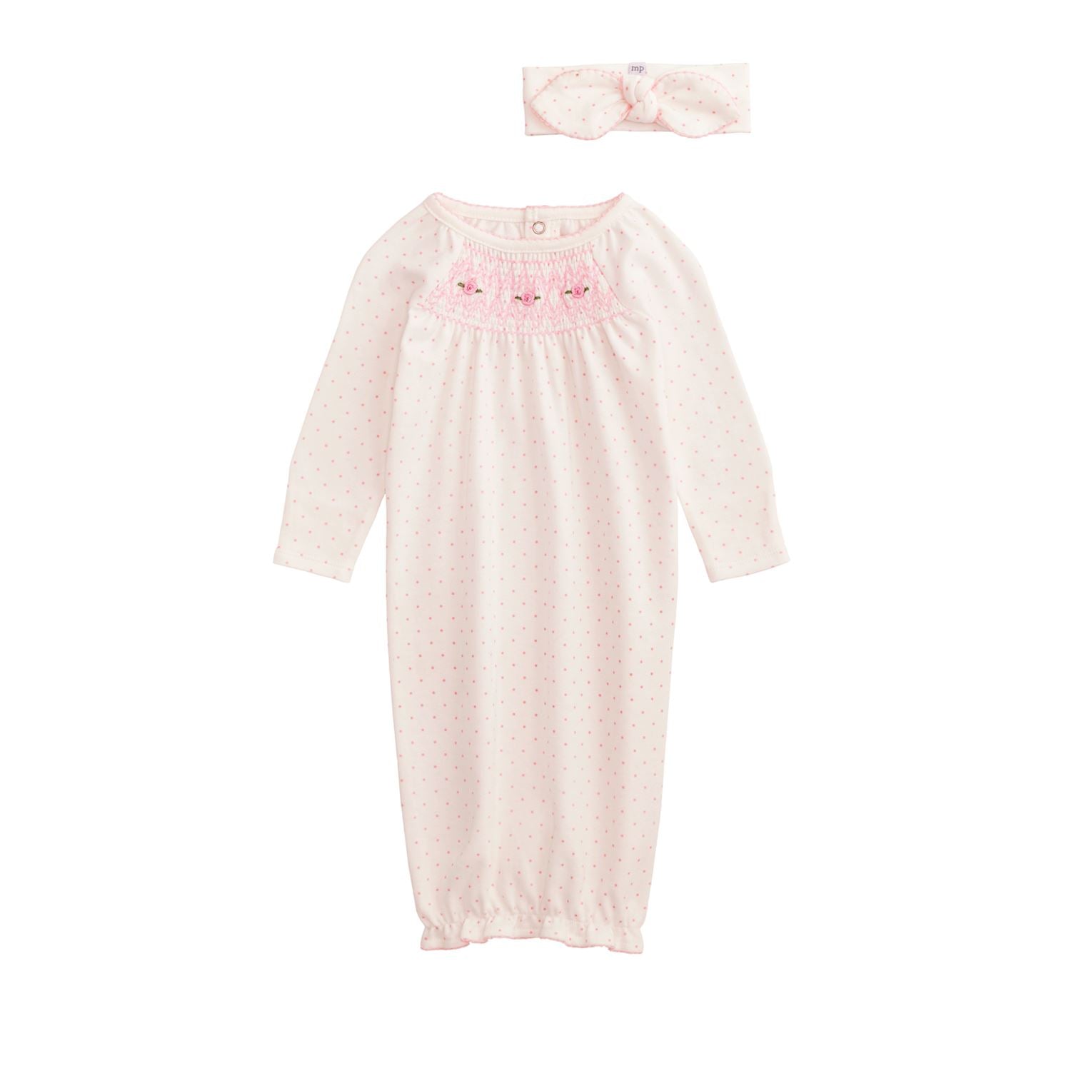 2-piece set. Cotton interlock gown features chest smocking with embroidered rosebuds and ruffle hem. Comes with coordinating bow headband.