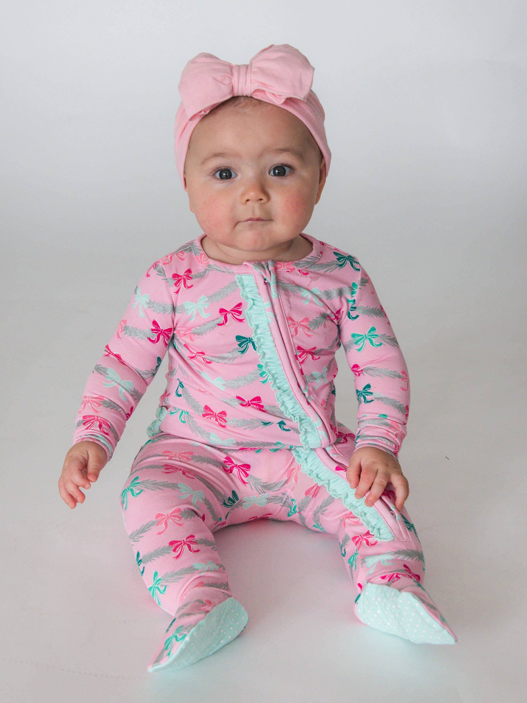 RuffleButts + RuggedButts - SoftSnooze™ Baby Girls Cotton Modal Sparkle Pink Tinsel Tidings Footed Ruffle One Piece Pajama