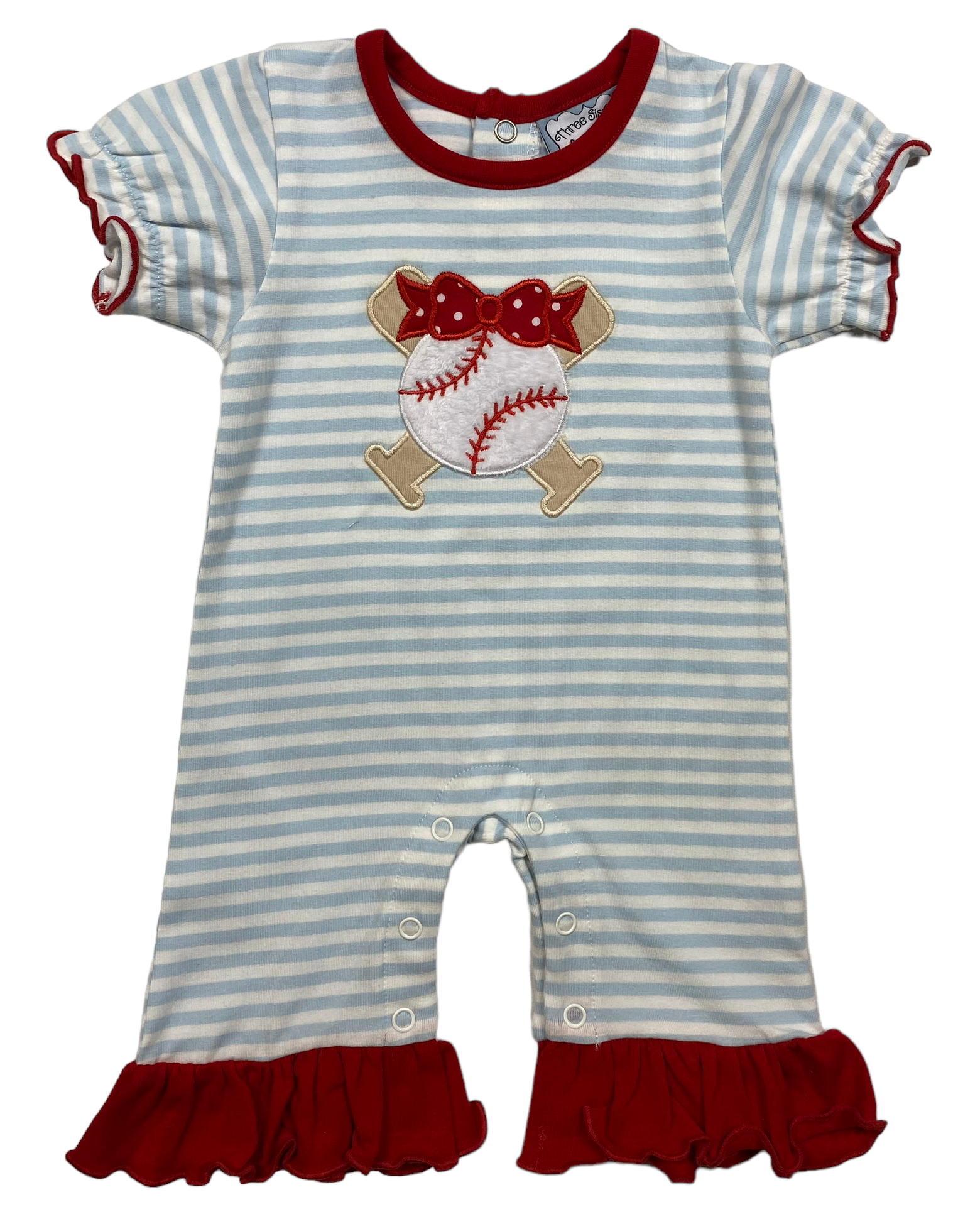 Three Sisters Baseball Romper is perfect for your ball loving baby. It is blue and white striped with red ruffled cuffs around the hands and feet.