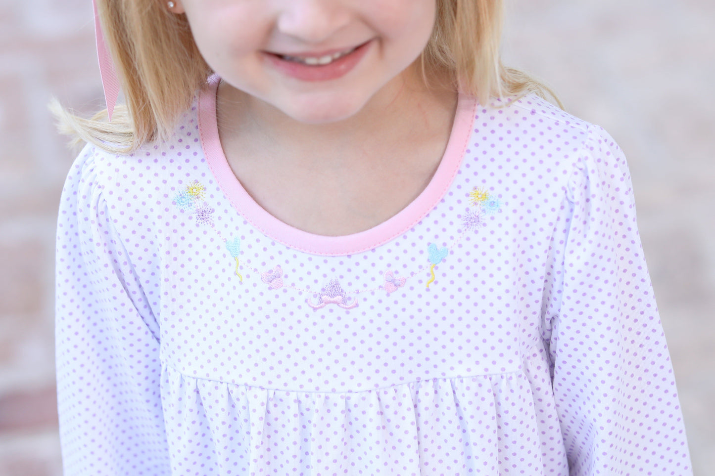 Add some magic to your wardrobe with the Magical Embroidery Dress! This playful piece features a embroidery of a magical theme along the collar, accented with a light pink trim and fun purple dots on the top. Matching sister outfits available!